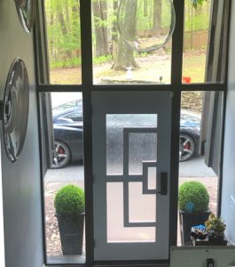 From the interior perspective, the door transforms into a sophisticated design feature that enhances the home’s modern aesthetic. The frosted glass softly diffuses daylight into the entryway, creating an inviting glow that brightens the space without sacrificing intimacy. The geometric pattern reads as functional art, echoing contemporary design principles and setting the tone for the interior décor beyond the threshold.