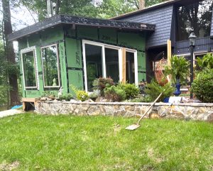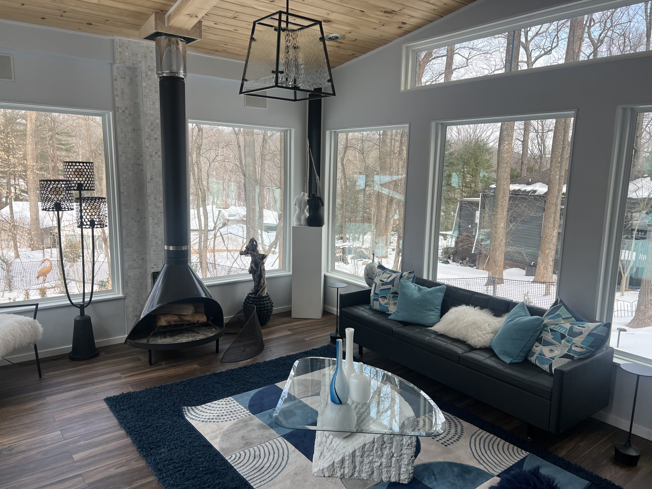 Bathed in natural light, this serene sunroom celebrates the beauty of the outdoors while offering a tranquil, modern retreat inside the home. Expansive windows and glass doors frame wooded views on all sides, creating an immersive connection to nature and allowing sunlight to pour across the warm wood flooring throughout the day. Soft gray walls provide a calm backdrop that enhances the brightness without competing with the scenery.